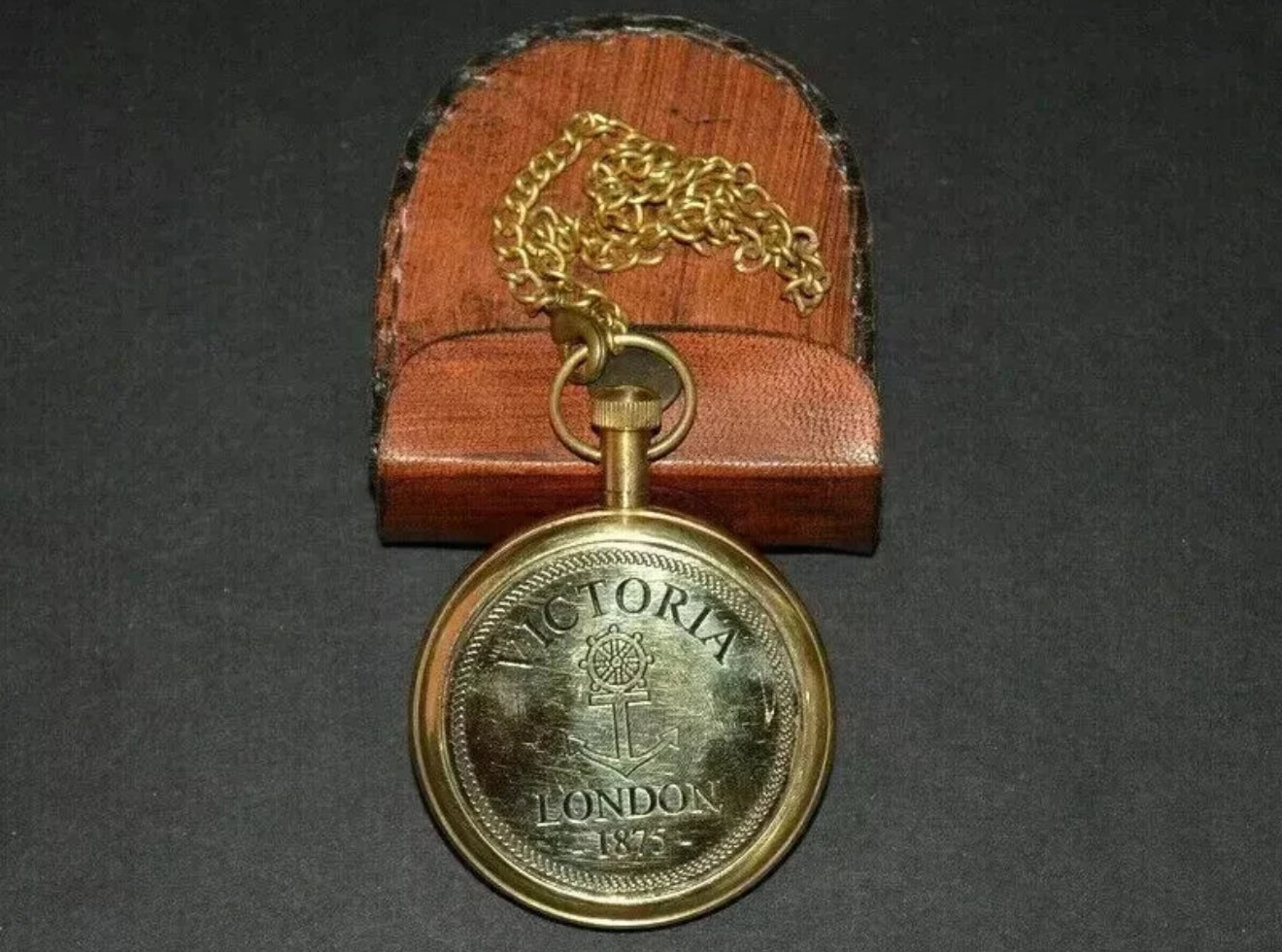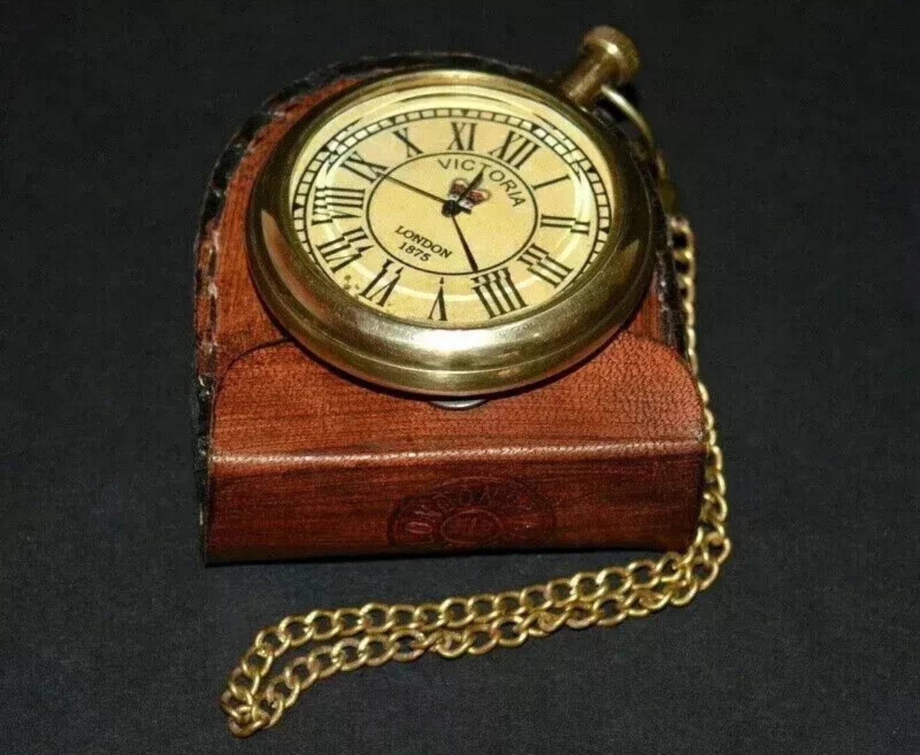 ساعة جيب عتيقة من النحاس الأصفر فيكتوريا 1875 مع علبة جلدية